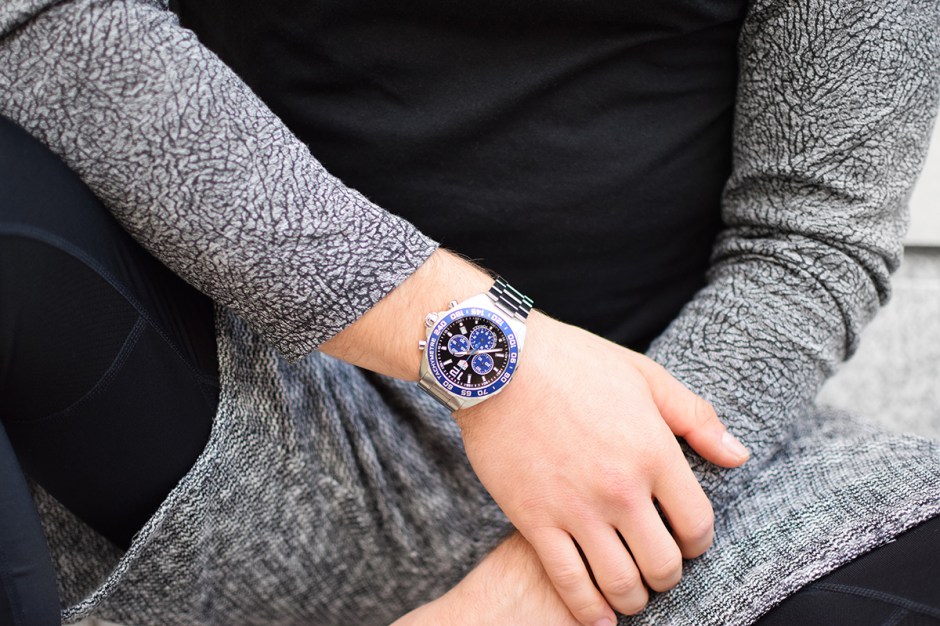 I love that this timepiece has a classic design but with complex modern functions. The black dial is sleek and stylish and the hand-applied, luminescent hour hands and minute markers add a modern twist. Its smooth and polished design can adapt to any outfit and I think it added style and sophistication to this sport look today.